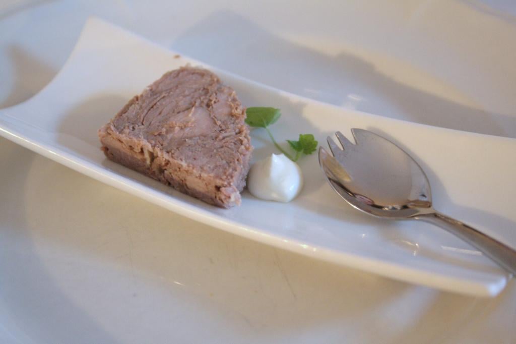 Ihan ensimmäiseksi meille tuotiin kuitenkin amuse bouche, joka esitteli täydellisesti ravintolan idean. Pieneen suupalaan oli saatu kaikki se mitä odotimme ravintolalta ja mitä illalliseltamme myös saimme. Todella taidokasta. Terriini oli muistaakseni tehty lampaan lihasta ja se oli oikein maukasta. Viimeistään tässä vaiheessa aloimme odottaa innolla illallisen kunnolla starttaavia alkuruokiamme.