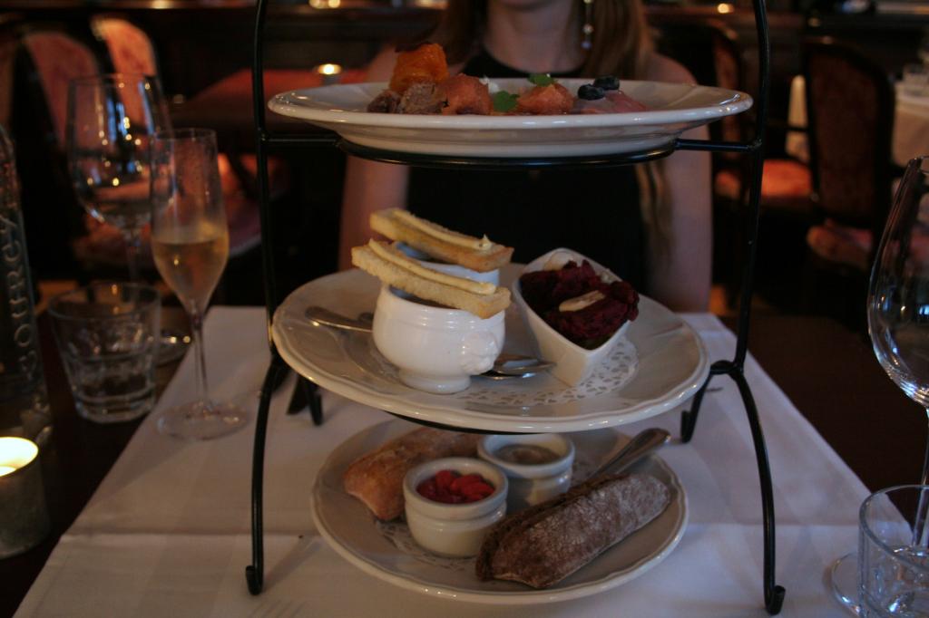 Pian eteemme kannettiin kaksikerroksinen tarjotin, josta löytyi pienet suupalat kaikkia listan alkuruokia. Alimpana hengailivat leivät levitteineen. Yritimme olla tarkkoja ja painaa mieleemme kaikkien ruokien sisällön tarjoilijan kuvaillessa herkkujamme, mutta emmehän me niitä enää muistaneet kunnolla siinä vaiheessa kun aloimme maistella ruokaa. Ruokalistakin on ehtinyt vaihtua tätä kirjoittaessani, joten en pääse lunttaamaan annoksia ravintolan nettisivuiltakaan.