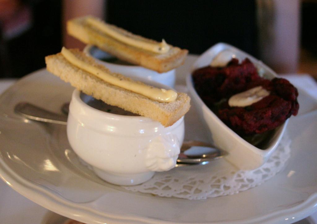 Saimme eteemme taas ihanan kerrostarjottimen, johon oli koottu valloittavaa tuoksua ympärilleen levittäviä jälkiruokamaistiaisia. Olisin halunnut tarrata suklaakakkuun tarjoilijan vielä esitellessä tarjottimen sisältöä, ja sain pistää kaiken tahdonvoimani peliin etten kahmaissut jälkiruokia suuhuni ennen aikojaan. Nämä pitäisi vielä kuvatakin ennen kuin saan käydä herkkuihin kiinni.