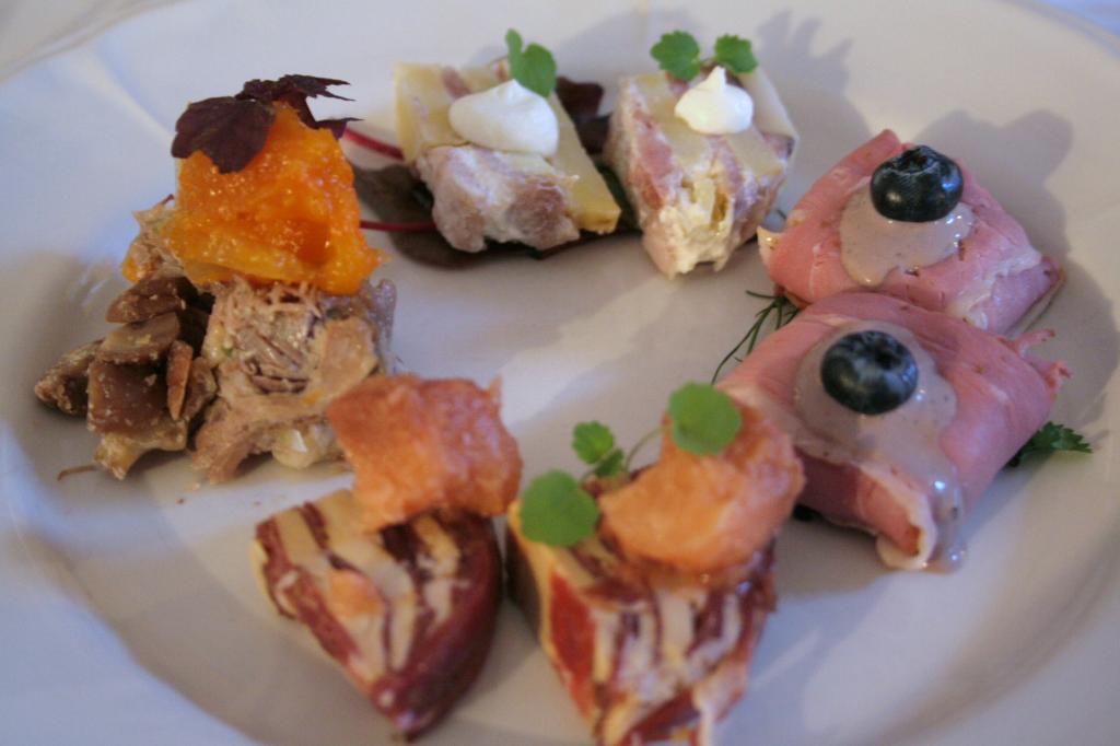 Herkullisia alkuruoat kuitenkin olivat, sen muistan erittäin hyvin. Tuo yksi lihapötkäleen päällä nököttävä vaaleanpunertava pallero vei kielemme mennessään ja olemme aika varmoja että se oli hanhenmaksaa. Voi nam. Myös mustikalla viimeistelty lihakäärö oli tosi namia ja se mustikka siinä kruunasi koko homman. Ihme kyllä, itse en olisi osannut yhdistää mustikkaa lihaan.