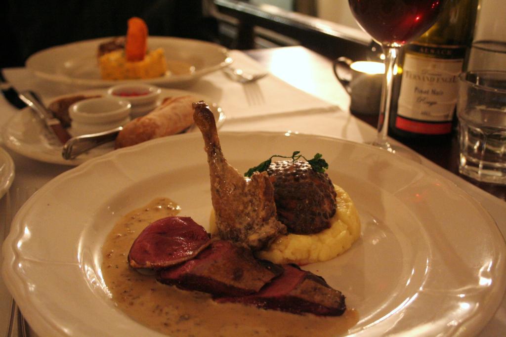 Alku- ja jälkiruoat oli helppo valita, sillä ruokalistalta löytyy kokoelma kaikista ravintolassa tarjottavista alkuruoista sekä samanlainen kokoelma jälkiruoista. Me otamme tietenkin ne, niin pääsemme maistamaan kaikkea. Pääruoan kanssa tuli sen sijaan pieni tenkkapoo. Mitäs me otettaisiin? Päädyimme lopulta ottamaan toiseksi pääruoaksi haddockia, vaikka emme muistaneetkaan siihen hätään mikä englanninkielisen sanan suomennos on. Jotain kalaa se on kuitenkin, ja koska lisukkeet kuulostavat hyvältä otamme sen. Toiseksi pääruoaksi valitsimme ankkaa.