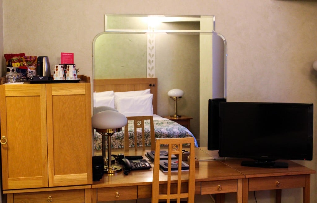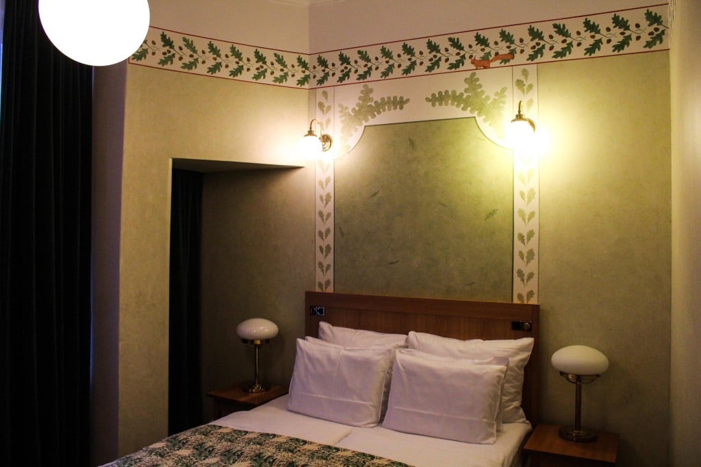 Me yövyimme Solo Queen -huoneissa ja hotellin vastaanotossa meitä pyydettiin valitsemaan haluammeko huoneemme romanttisella jugend-sisustuksella vai modernimmalla art deco -sisustuksella. Valitsimme jugendin ja olimme oikein tyytyväisiä söpöön huoneeseemme. Pehmeässä sängyssä nukkui kuin tukki ja pään alle sai valita kolmesta eri kokoisesta tyynystä mieluisimman. Minä otin isolle päälleni isoimman tyynyn ja se oli ihanan muhkea.