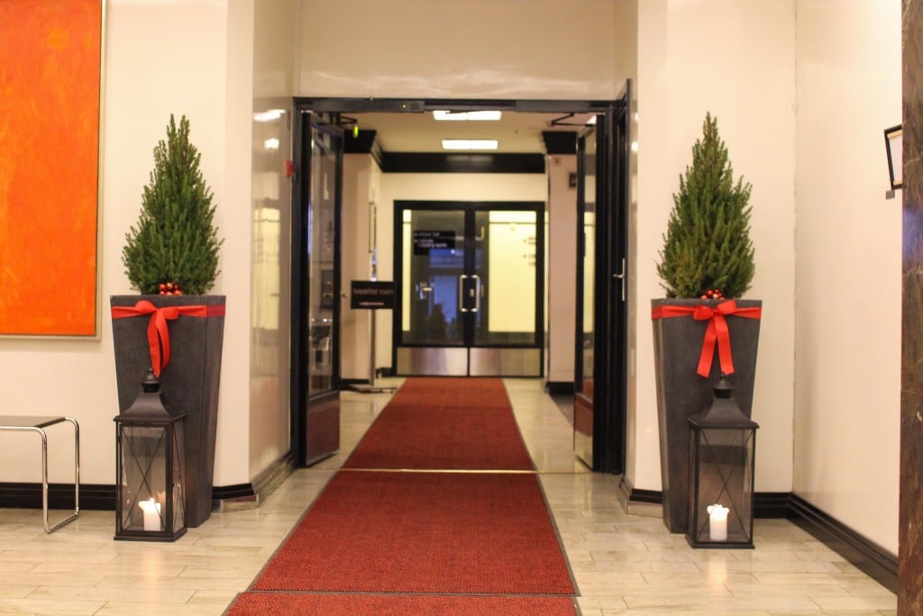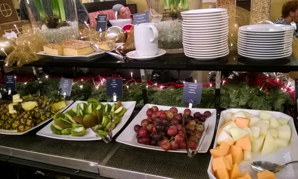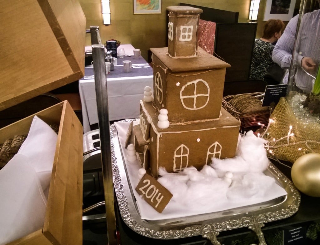 Aamiaistila oli ihanan tunnelmallinen. Joulukoristeet loivat jouluista tunnelmaa ja kaikista hienoin niistä oli buffet-pöydästä löytyvä piparkakkutalo, joka oli tietenkin rakennettu Hotelli Tornin muotoon. Napsin lautaselleni ihania juustoja, lämpimiä karjalanpiirakoita, mehukkaita hedelmiä ja se pekonikin oli juuri niin rapeaa kuin oli luvattu. Mehulasit olivat kerrankin tarpeeksi isot ja appelsiinimehu oli aivan taivaallista. Myös kahvi oli kuulemma kelpokamaa ja pöytään olisi saanut tilata lisämaksusta myös muun muassa omeletteja, pannukakkuja, smoothieita ja skumppaa. Ihana aamiainen. Emme keksineet kerrassaan mitään moitittavaa.