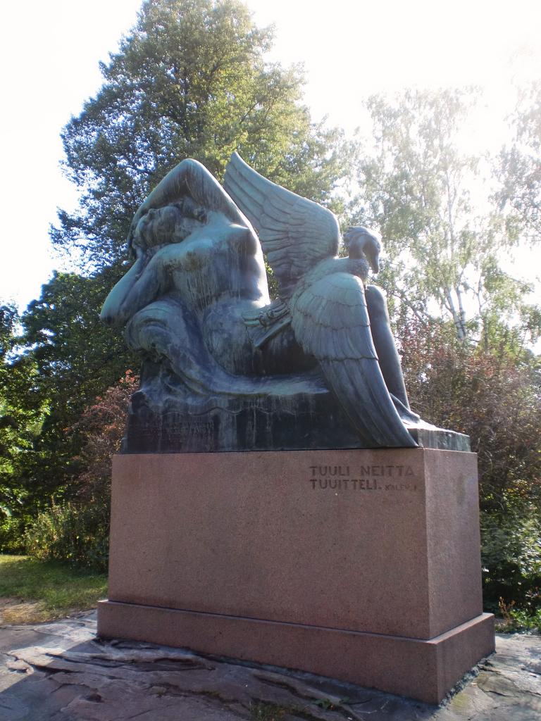 Ensimmäinen Sibeliuksen puistosta löytämämme taideteos on Kalevalan luomismyyttiä kuvastava Ilmatar ja Sotka -niminen patsas. Siinä sotka hautoo munaa Ilmattaren sylissä, ja kun munankuori halkeaa, syntyy sotkanmunasta koko maailma. Tästä pidimme kovasti, emmekä vähiten sen takia, että patsaan edessä päivää paistatteli suloinen koira. Sekin ymmärsi hyvän taiteen päälle. Kari Juvan patsaalle koirat eivät pysähtyneet edes nostamaan koipea.