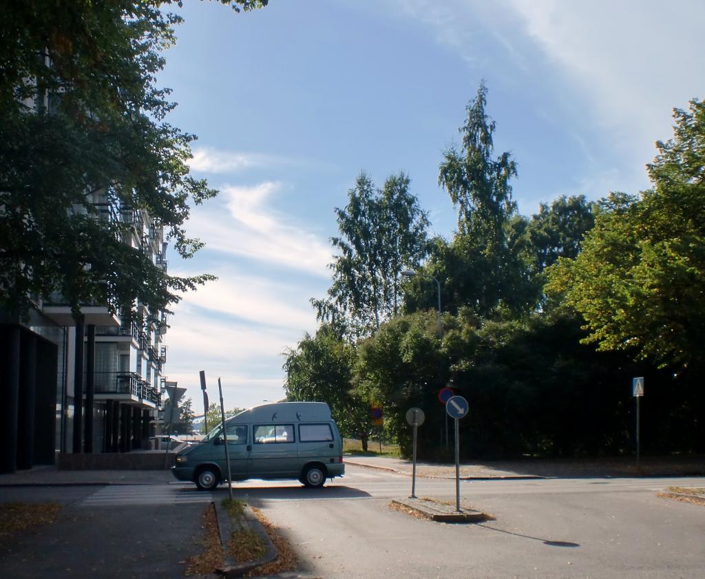 Seuraavaksi etsimme Kesäkatua, sillä olisimme halunneet laulaa siellä Dannya ja katsoa kuinka kosteaa höyryä nousee tiestä. Kiersimme kadun kuitenkin lahjakkaasti ja tyydyimme lopulta vain katsomaan Mechelininkadun toiselta puolelta, että tuossa se Dannya polttava katu nyt on. Kuvassa sen eteen on tietenkin osunut auto. Hyvin mä olen taas katsonut mitä ja miten kuvaan..