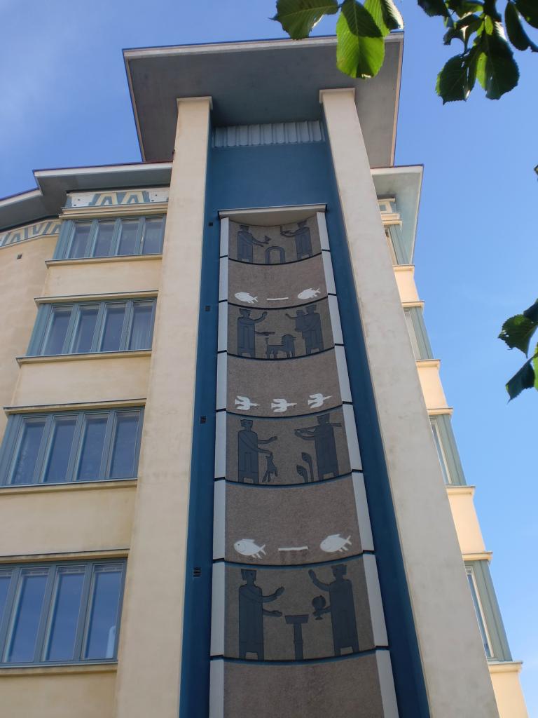 Juuri kun olimme haukkuneet Töölön rumaksi, löysimme jotakin melkoisen kaunista. 1930-luvulla valmistunut Art Deco -kortteli oli yksi koko Töölön lemppareistani Sibelius-monumentin sekä Cafe Regatan lisäksi. Sandelsinkadun, Välskärinkadun, Pohjoisen Hesperiankadun ja Runeberginkadun rajaamassa korttelissa on hauskan värisiä ja koristeellisia taloja, joista omat suosikkini sijaitsivat Välskärinkadulla. Tässä kohtaa Töölö oli kaunis ja rauhaisakin, ainakin niin kauan kuin piti katseensa Art deco -taloissa, eikä kurkistanut tien toisella puolella möllöttäviin karuihin kerrostaloihin, joista pari oli harvinaisen luotaantyöntävän näköisiä.