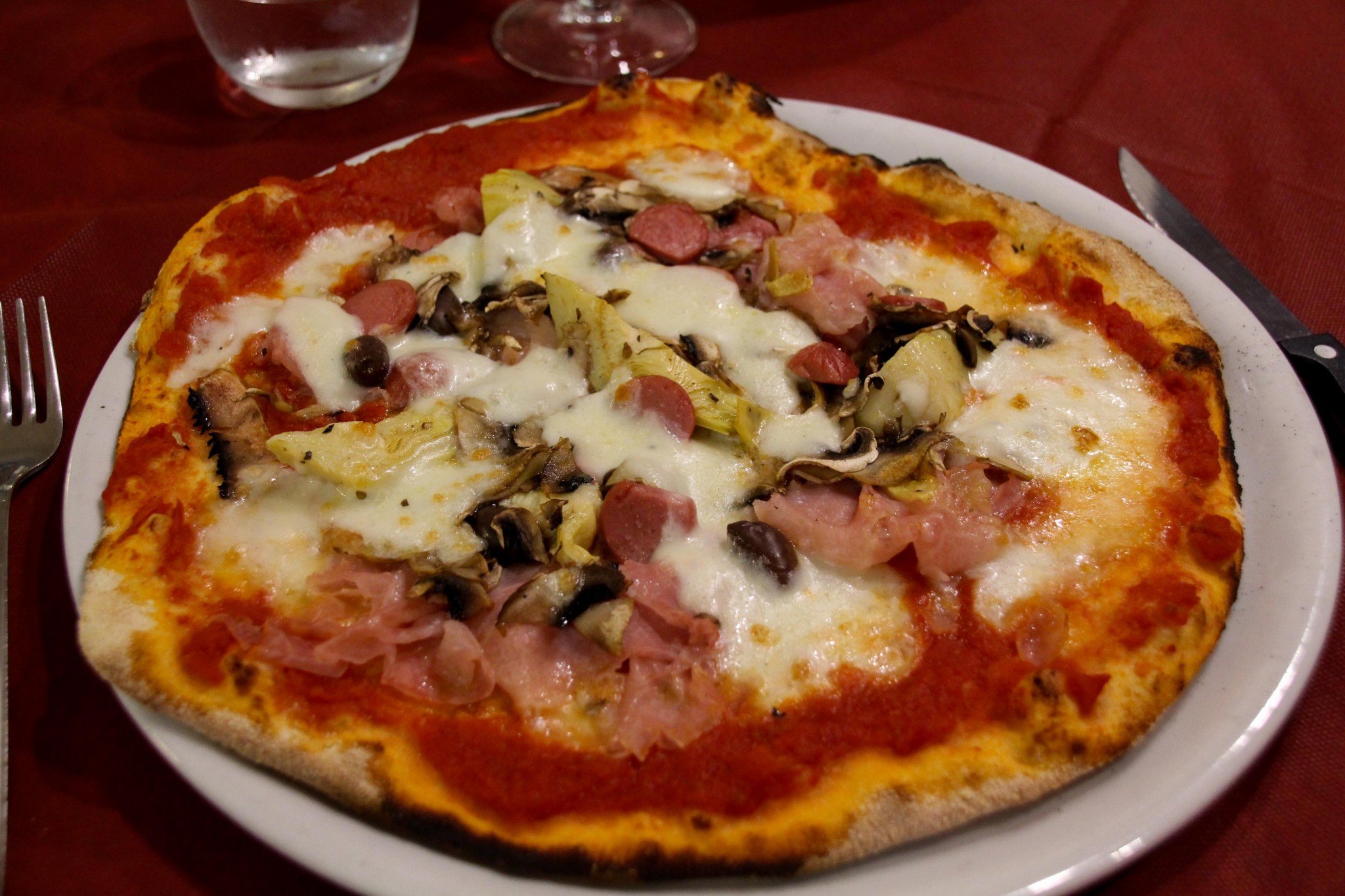 Toiseksi pizzaksi valitsimme tavallisemmat hyvinkin lihaisat täytteet. Kuten arvata saattaa, myös täällä pizza oli herkullista. Kyllä italialaiset vaan osaavat nämä pizzanpaistopuuhat.