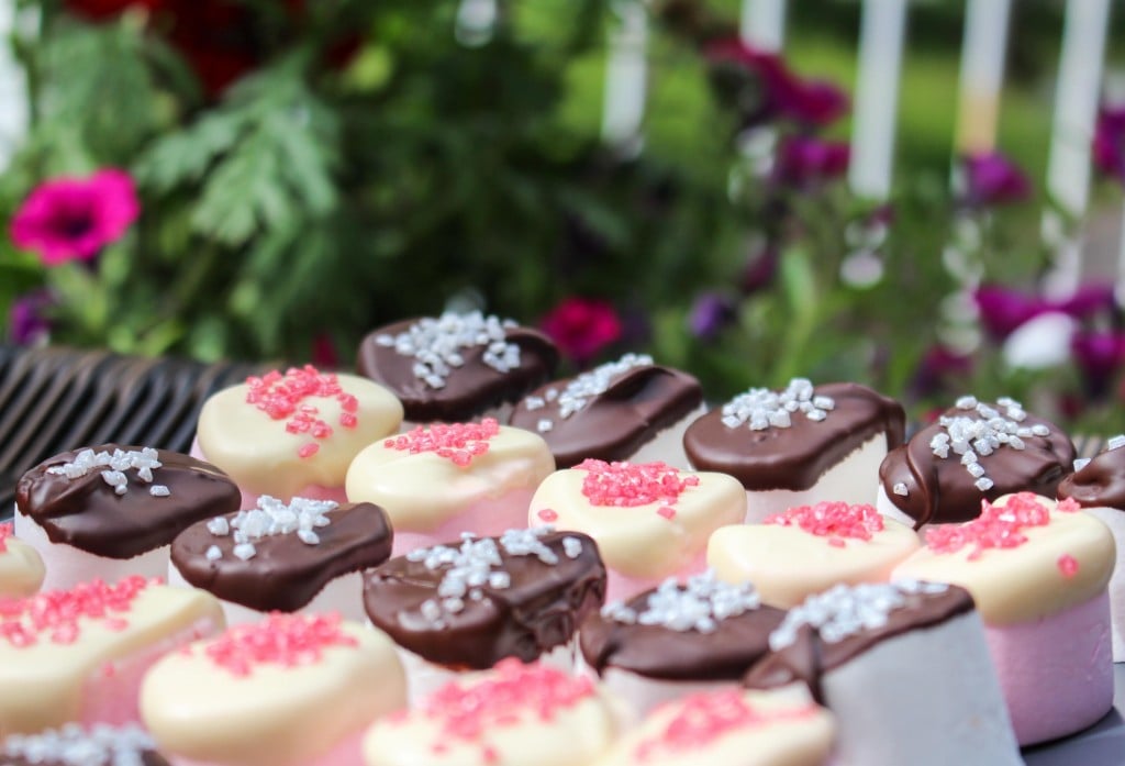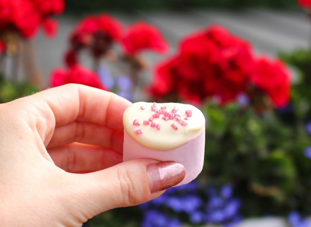 Ostin kasan isoja valkoisia ja vaaleanpunaisia vaahtokarkkeja, kaivoin kätköistä sinne unohtuneen taloussuklaan ja ostin lisäksi lemppariani valkosuklaata, sekä valitsin suupalojen koristeeksi kauniin värisiä nonparelleja.