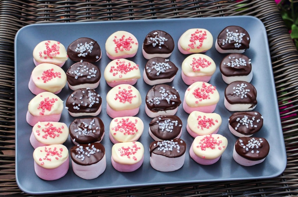 Suklaakuorrutetut vaahtokarkit sopisivat söpösti myös vaikkapa kastejuhlan tarjoilupöytään, kotibrunssille, piknikille tai pieneksi naposteltavaksi kuohuviinin kanssa. Meillä näitä syötiin tosiaan läpi juhannusviikonlopun ja taisinpa minä napsia muutaman namun suuhuni myös aamiaiseksi. Koska mä voin ja koska ne oli niin houkuttelevan näköisiä.