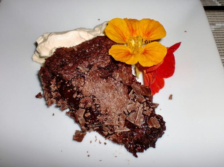 Sekoita kananmunat ja sokeri keskenään ja vatkaa ne vaahdoksi. Sulata voi ja sekoita se munasokeriseokseen. Lisää kuivat aineet sekä puolet rouhitusta suklaasta, sekoita hyvin ja kippaa taikina voideltuun irtopohjavuokaan. Paista kakkua 175-asteisessa uunissa 25-30 minuuttia, niin että sen reunat kovettuvat, mutta keskus jää löysäksi. Anna kakun jähmettyä kunnolla, mieluiten yön yli, ja koristele se ennen tarjoilua lopulla suklaarouheella.