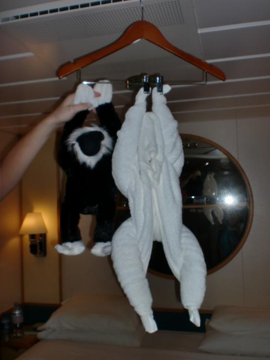 Hania-päivän iltana hytistä löytyi pyyhkeistä tehty apina, johon Mattie-simpanssi näytti olevan vähän ihastunut.