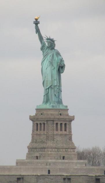 Jos nyt rehellisiä ollaan, niin Vapaudenpatsas oli jos ei nyt varsinainen pettymys, niin hyvin vähän mihinkään suuntaan hetkauttava kaveri meren syleilyssä. Eniten yllätyin sitä, miten pieneltä se näyttää. Täytyy käydä tuijottelemassa patsasta vielä ihan vierestäkin Liberty Islandilla ennen kuin voin muodostaa siitä kunnollisen mielipiteen, mutta ohilipuvan lautan kannelta luotujen katseiden perusteella patsas oli vaatimattomampi kuin odotin. Ihan hieno, mutta ei yhtään niin vaikuttava kuin vieressä kohoavat pilvenpiirtäjät. Voi toki olla, että olin jo niin vaikuttunut ja pyörällä päästäni kaupungin mahtavuudesta, ettei yksi pieni patsas kyennyt enää herättämään minussa isoja tunteita.