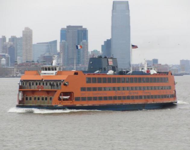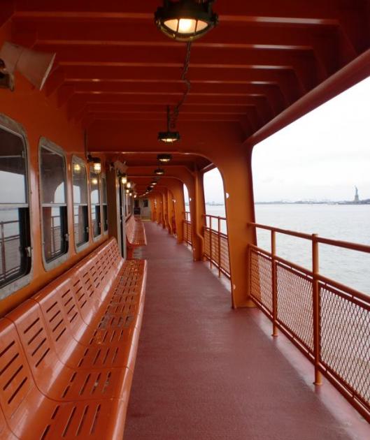Staten Island Ferry on se sellainen oranssi lautta, joka on näkynyt monessa tv-ohjelmassa ja elokuvassa. Sillä matkustaminen on ilmaista ja se koukkaa aivan Vapaudenpatsaan vierestä. Siinäpä kaksi syytä, miksi lauttamatka on suosittu myös turistien keskuudessa eikä pelkästään Staten Islandilla asuvien työmatkan helpottajana. Meidän kohdalle osui mukavan tyhjä lautta, joten saimme rauhassa valita hyvän paikan, josta tsuumata Manhattanin edustalla möllöttävää patsasta.