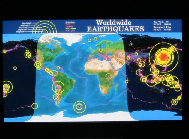 Kuvassa näkyvät maailmalla tapahtuneet maanjäristykset ja juuri reissuamme ennen oli Japanissa ollut iso maanjäristys (muistanette uutisista kun Fukushima oli pulassa). Tästä sai aika hyvän käsityksen kuinka isosta järistyksestä oikeastaan oli kyse. Puolet kartasta on Japanin rinkuloiden peitossa. Onneksi matkamme suuntautui Jenkkeihin eikä Japaniin..