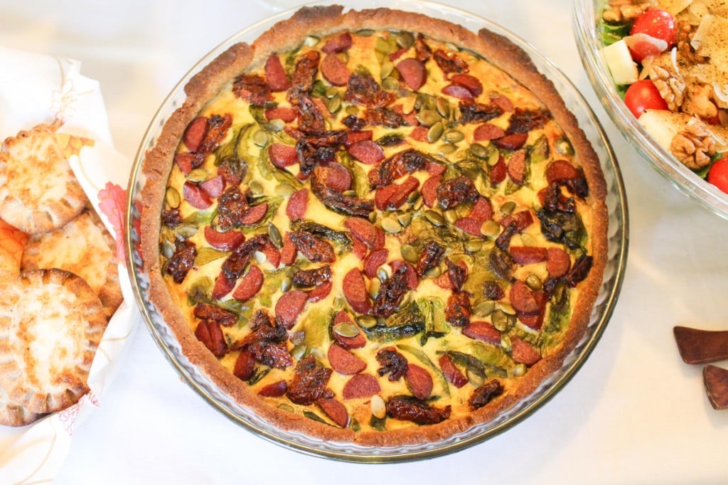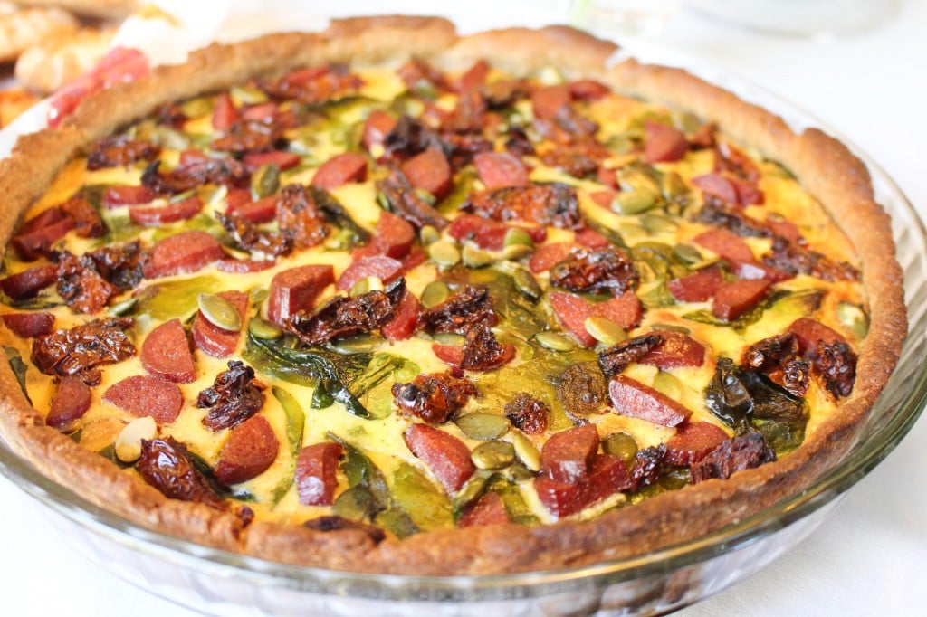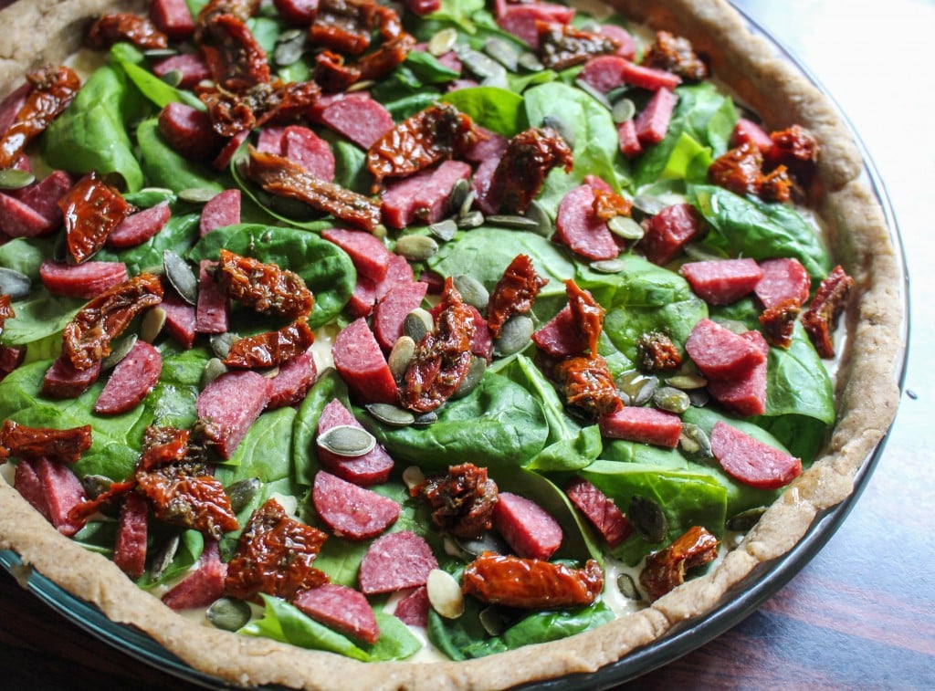 Sekoita kerma, kananmunat ja juustoraaste kulhossa ja kaada piirakkataikinan päälle. Levitä päälle pinaatinlehtiä, salamiviipaleita, aurinkokuivattuja tomaatteja ja siemeniä.