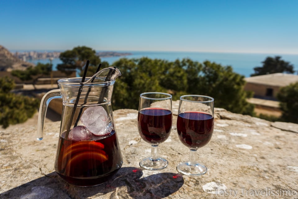 Toimii kaikkialla. Jopa niillä turistiterasseilla, joiden aurinkoiset sijainnit ovat kieltämättä aika kivoja, vaikka ruokapuoli ja joskus myös palvelu ontuvatkin. Maista perinteisen punaviinisen sangrian lisäksi cavasangriaa. Kuvan sangria on tilattu Santa Barbaran linnan terassilla, jonka lempeässä auringossa oli mukava viettää hieman pidemmäksikin vierähtänyt tovi reippaan kukkulalle kiipeämisen jälkeen.