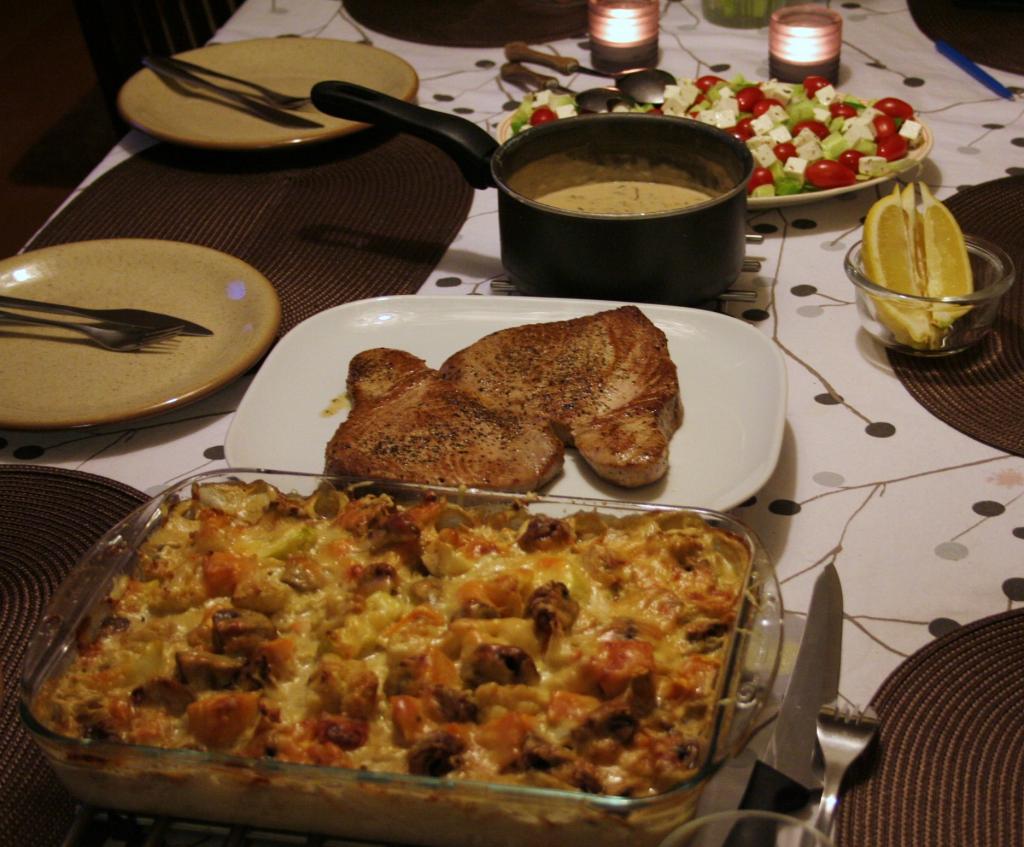 Tarjoile tonnikala raikkaiden lisukkeiden kanssa. Meillä tonnikalan kanssa pöytään katettiin ainakin sitruunaa, sienikastiketta, fetasalaattia ja kasvisgratiinia.